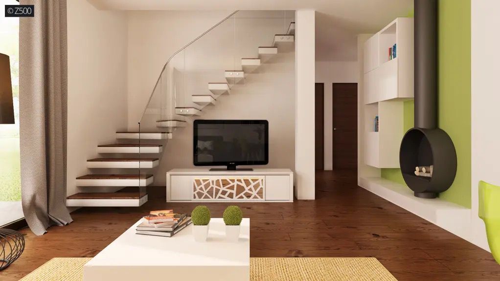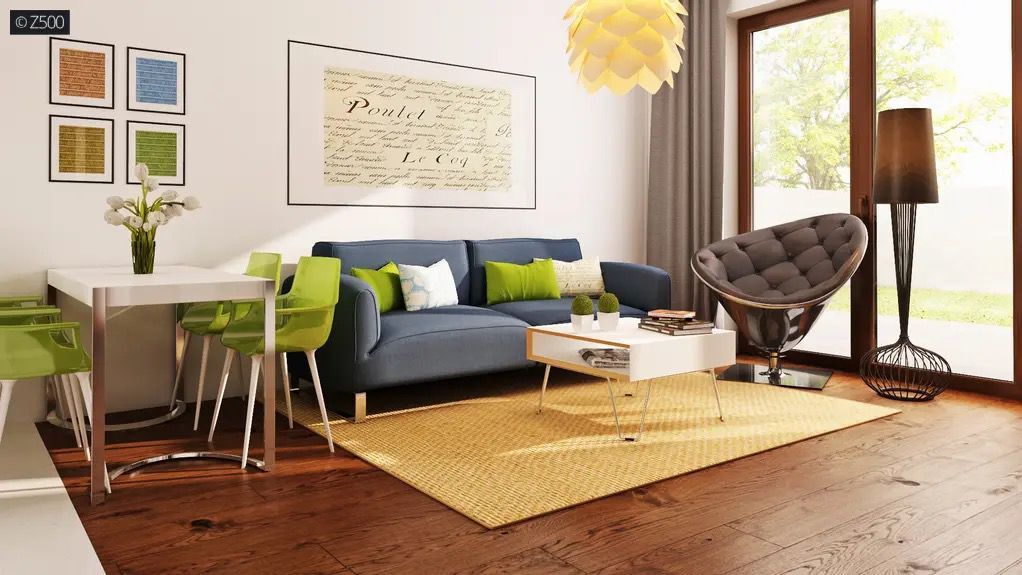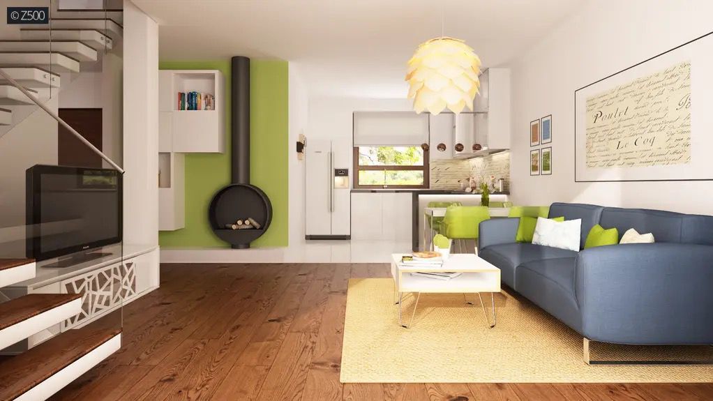 Strefa dzienna: salon z aneksem kuchennym i jadalnią, wyjście na taras