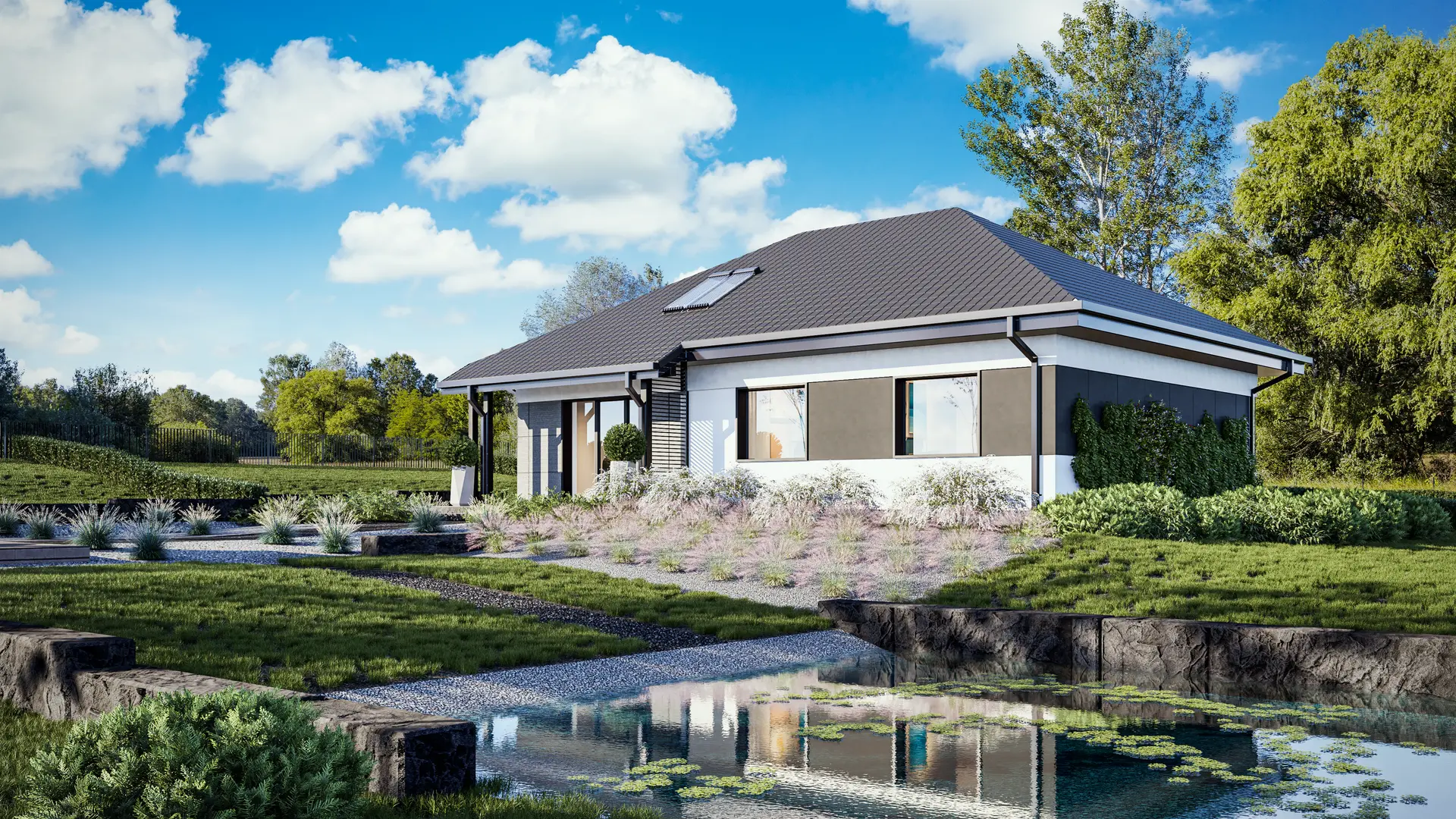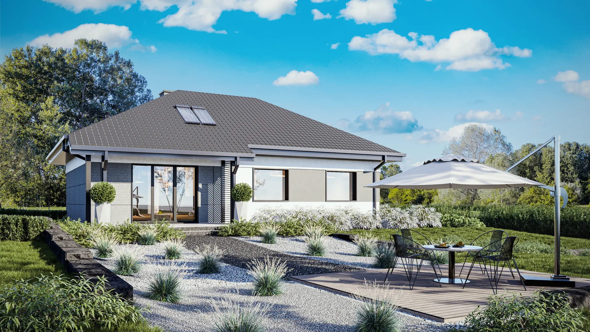 Elewacja: tynk wapienno-cementowy typu „baranek” – biały w standardzie, inny kolor z palety RAL za dopłatą